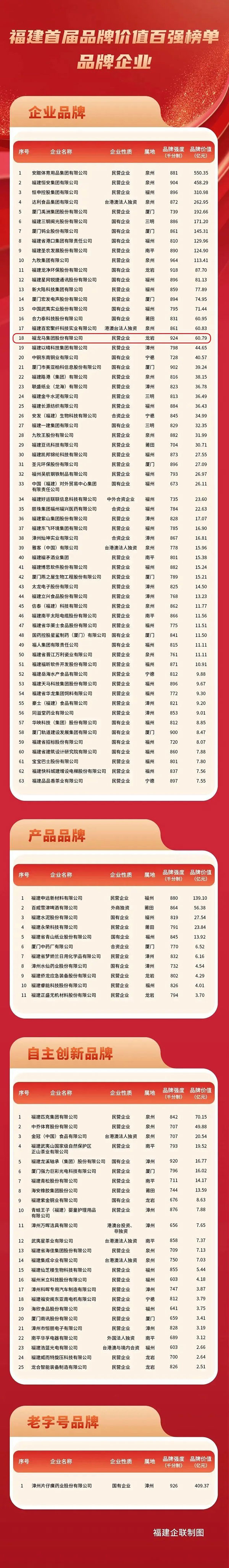 5月7日,福建首屆品牌價值百強榜單發(fā)布會在寧德舉辦。福龍馬集團股份有限公司以品牌價值60.79億元入選“福建首屆品牌價值百強榜單”,位列企業(yè)品牌第18名!