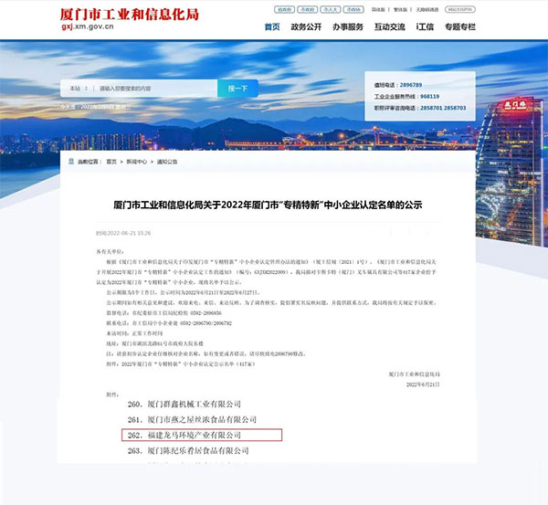 福建龍馬環(huán)境產(chǎn)業(yè)有限公司成功入選廈門市“專精特新”企業(yè)名單