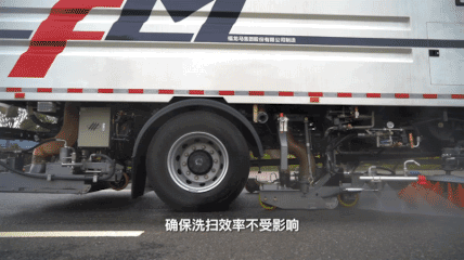 該車采用“中置兩盤掃+中置V型噴水架+中置雙吸口寬吸嘴結(jié)構(gòu)+后置深度保潔寬吸嘴+左、右高壓側(cè)噴桿”, 左右噴桿同時擺出時,最大洗掃寬度可達(dá)4.1m。