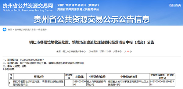 年關(guān)將至傳捷報(bào),策馬揚(yáng)鞭正當(dāng)時(shí)。近日,福龍馬集團(tuán)旗下業(yè)務(wù)板塊龍馬環(huán)境科技又迎來了一中標(biāo)喜訊,繼長(zhǎng)汀項(xiàng)目之后,公司于2022年12月21日以2.698億成功中標(biāo)銅仁市餐廚垃圾收運(yùn)處置、填埋場(chǎng)滲濾液處理站委托經(jīng)營(yíng)項(xiàng)目,項(xiàng)目運(yùn)營(yíng)期30年。該項(xiàng)目主要處理銅仁市餐廚垃圾及配套填埋場(chǎng)滲濾液,處理規(guī)模為餐廚垃圾100t/d、滲濾液80t/d,主體工藝采用“預(yù)處理+厭氧+污水處理”。