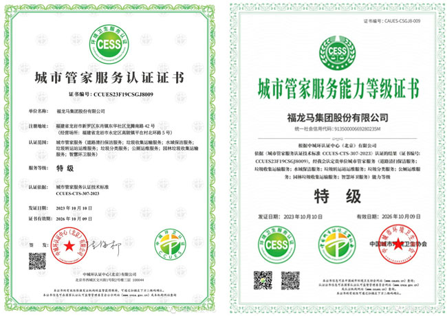 該認(rèn)證涵蓋了道路清掃保潔服務(wù)、垃圾收集運(yùn)輸服務(wù)、水域保潔服務(wù)、垃圾轉(zhuǎn)運(yùn)站運(yùn)維服務(wù)、垃圾分類服務(wù)、公廁運(yùn)維服務(wù)、園林垃圾收集運(yùn)輸服務(wù)以及智慧環(huán)衛(wèi)服務(wù)八個(gè)子項(xiàng),認(rèn)證結(jié)果得到了中國城市環(huán)境衛(wèi)生協(xié)會(huì)的采信認(rèn)定。獲得該認(rèn)證,是對福龍馬在城市環(huán)境衛(wèi)生管理方面卓越表現(xiàn)的充分肯定。