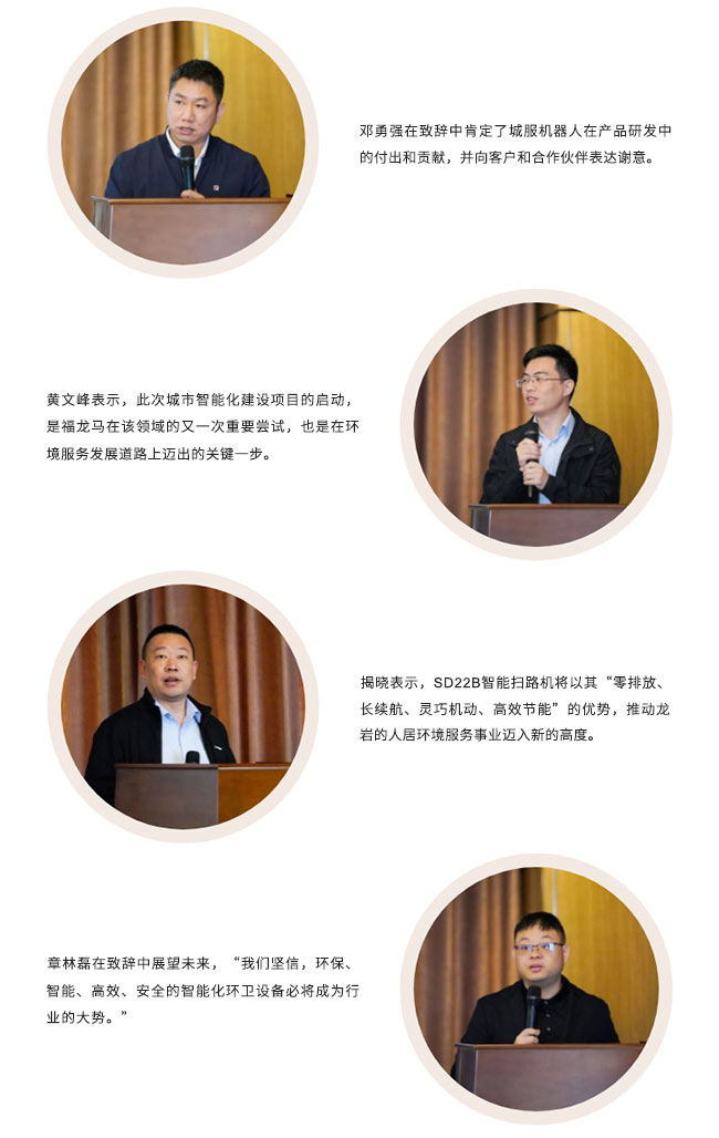 福龍馬集團董秘鄧勇強,福龍馬城服機器人總經理章林磊,環(huán)境服務事業(yè)部技術研究院院長黃文峰、閩贛戰(zhàn)區(qū)運營副總監(jiān)盧鐘輝,福建龍環(huán)總經理揭曉、副總經理吳強華、張桂濤出席本次交車儀式。鄧勇強、黃文峰、揭曉及章林磊等領導先后為儀式致辭。
