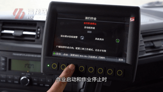 車輛采用"顯示屏+控制器+CAN總線操作面板"的控制模式。作業(yè)啟動(dòng)和作業(yè)停止時(shí),副發(fā)動(dòng)機(jī)轉(zhuǎn)速控制、吸嘴升降、掃盤收放等作業(yè)裝置全由一鍵控制,操作簡(jiǎn)便。車輛作業(yè)由三處操作裝置實(shí)現(xiàn),其中兩處在駕駛室內(nèi),一處在車輛后部右側(cè)的操作面板。