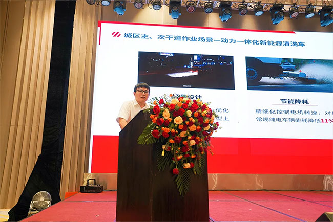 中國城市環(huán)境衛(wèi)生協會副會長兼秘書長劉晶昊在致辭中充分肯定了福龍馬集團在引領環(huán)衛(wèi)行業(yè)高質量發(fā)展方面所作出的突出貢獻,并就中國環(huán)衛(wèi)行業(yè)后續(xù)發(fā)展發(fā)表前瞻性、建設性意見建議。隨后,他向與會人員詳細解讀了公用領域設備更新及電動化政策。