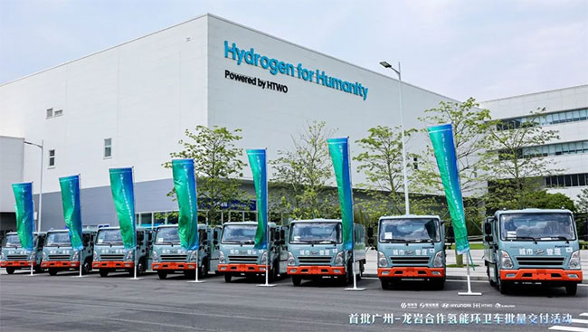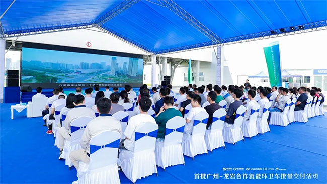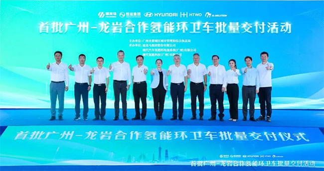 6月12日下午,首批廣州龍巖合作氫能環(huán)衛(wèi)車批量交付活動在廣州市黃埔區(qū)隆重舉行。廣州市城管局二級巡視員何正清,龍巖高新區(qū)(經(jīng)開區(qū))黨工委書記、管委會主任袁靜,黃埔區(qū)人民政府黨組成員、副區(qū)長黎信坤,廣州市黃埔區(qū)城管局局長吳其東,現(xiàn)代汽車集團中國區(qū)總裁李赫埈,廣州恒運企業(yè)集團股份有限公司總經(jīng)理周水良,福龍馬集團股份有限公司總裁張西泠,廣州市黃埔區(qū)城管局、廣州恒運集團、現(xiàn)代汽車集團、福龍馬集團職工代表,共計100余人參加此次活動。