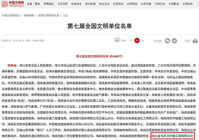 2025年5月23日,全國精神文明建設表彰大會在北京舉行,福龍馬集團旗下??邶堮R環(huán)衛(wèi)環(huán)境工程有限公司(以下簡稱:??邶堮R)憑借卓越的社會貢獻與精神文明建設成果,榮獲"全國文明單位"稱號。這一殊榮不僅是福龍馬人的驕傲,更是福龍馬集團深耕社會責任、踐行綠色發(fā)展理念的生動注腳。